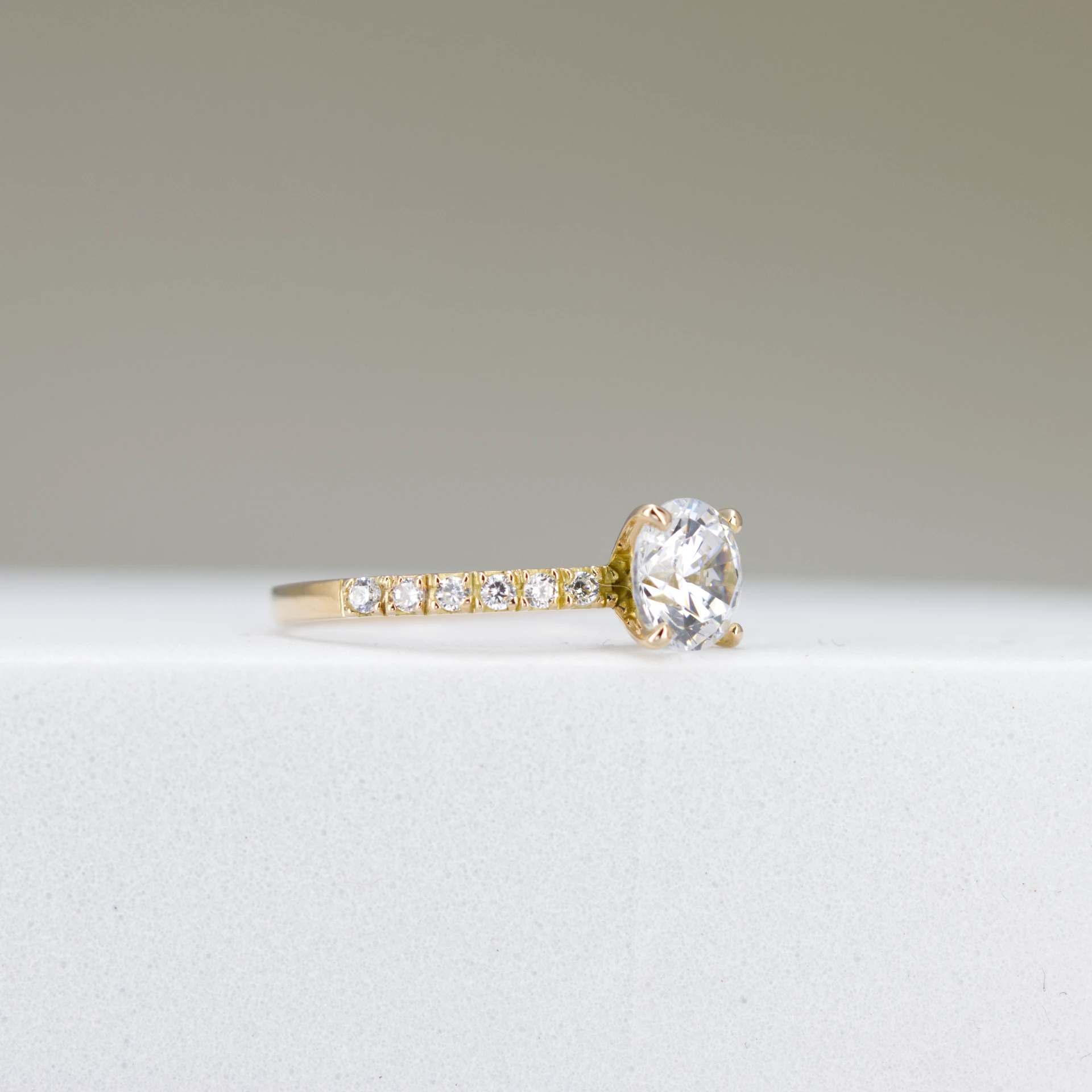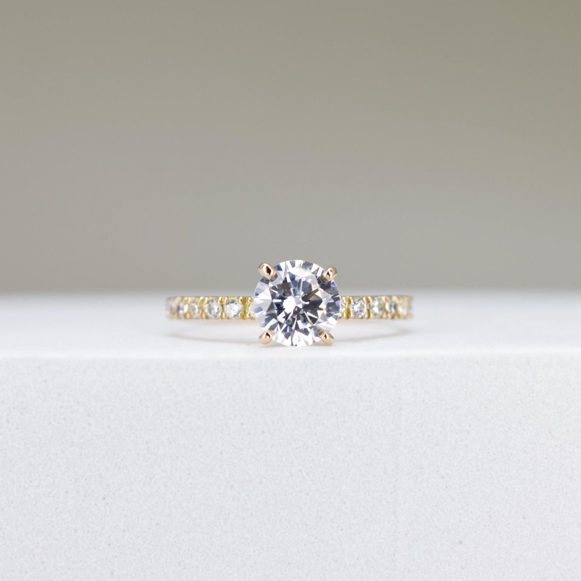 This 18K Yellow Gold Classic Pavé Set Ring features a dazzling round-cut center stone set on a refined pavé band. The carefully handset side stones enhance its brilliance, while the sleek 18K yellow gold band adds warmth and luxury.