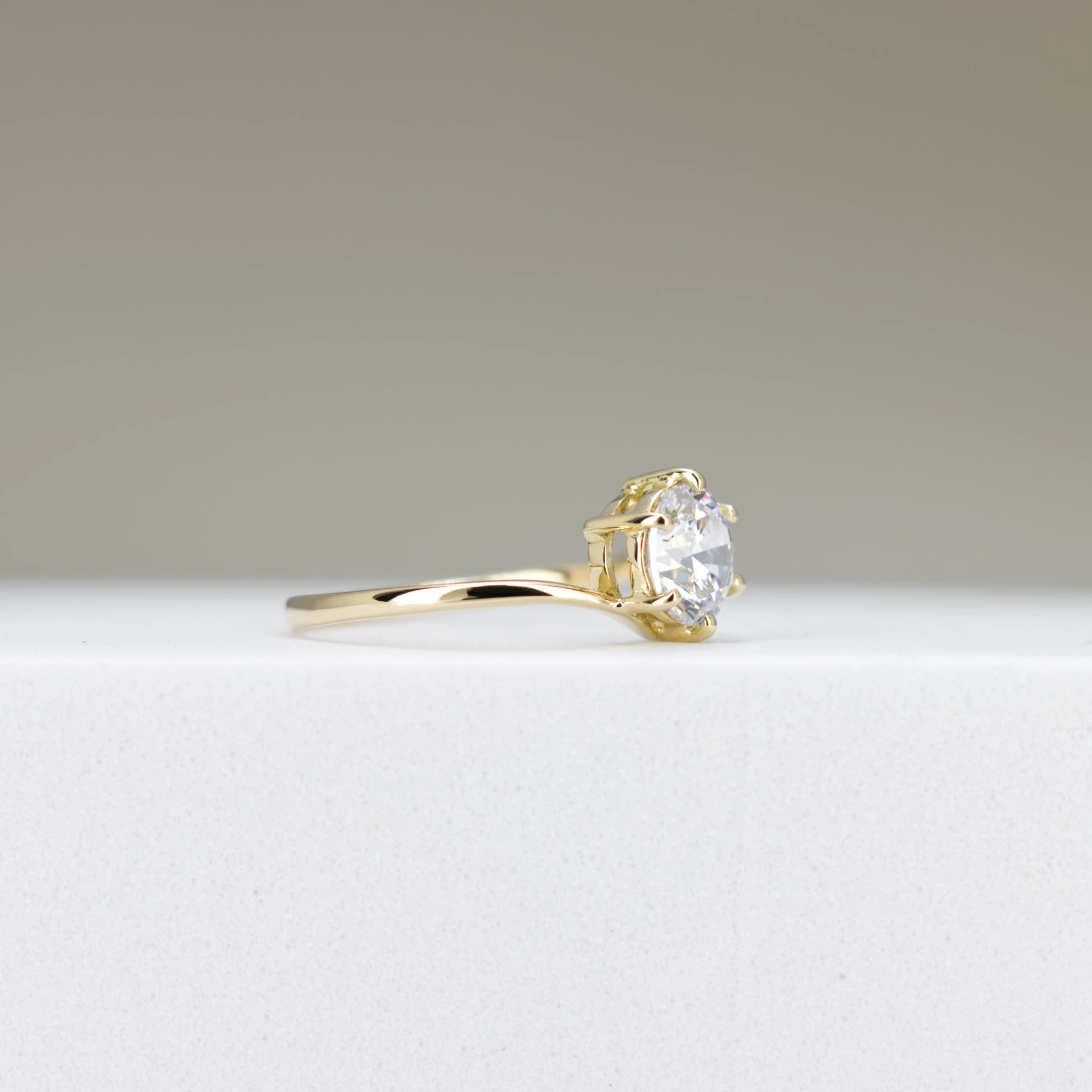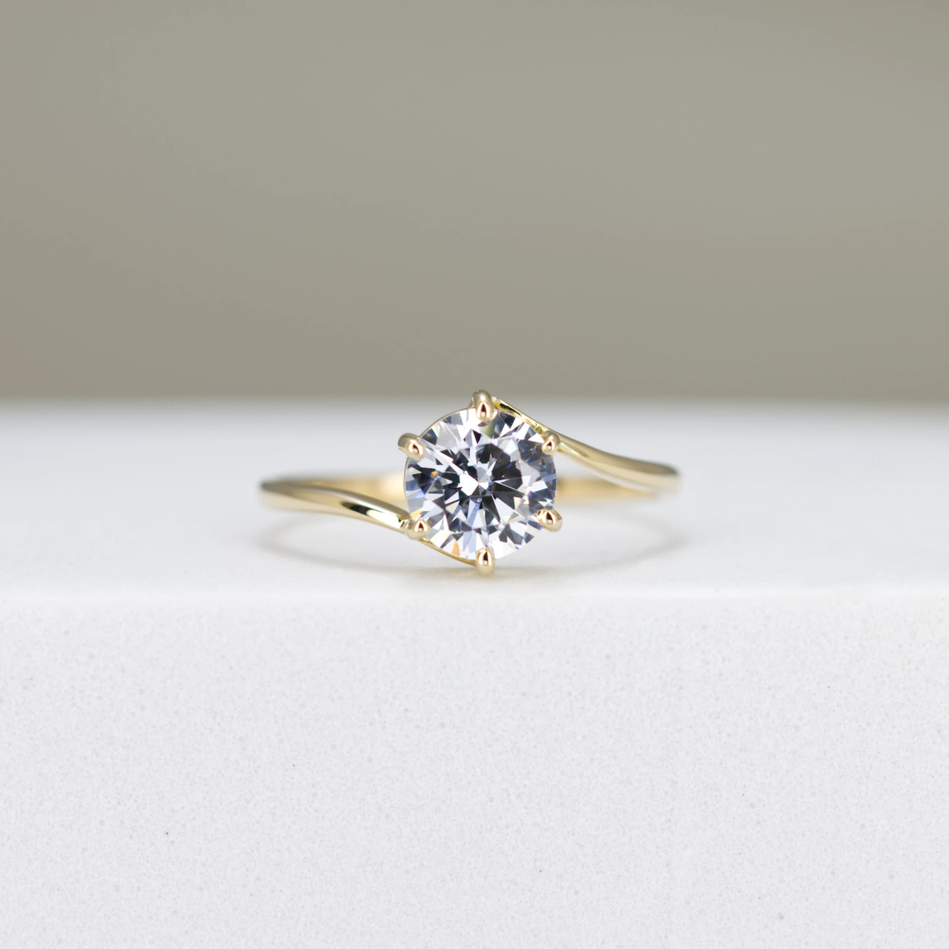 A symbol of grace and everlasting elegance, this 18K Yellow Gold Twist Solitaire Ring features a brilliant round-cut stone beautifully held in a unique twisting band design. The gentle curve of the band embraces the center stone, creating a modern look.