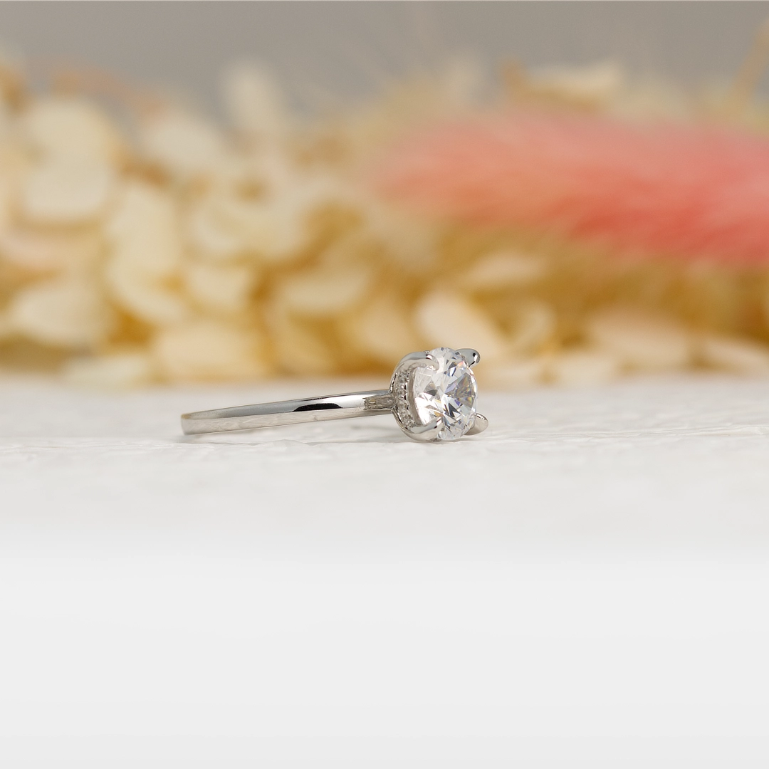 A timeless silver engagement ring featuring a brilliant round centre stone in a classic solitaire setting, enhanced with a delicate hidden halo for added sparkle. Designed with a clean and elegant band, this ring offers a refined and graceful look while beautifully highlighting the centre stone.