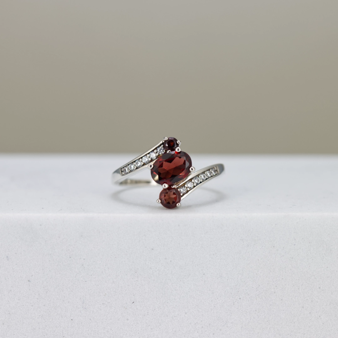 A striking wrap-style design featuring three deep red garnet stones arranged in a graceful curve. The center oval garnet is paired with two round garnets above and below, creating a flowing silhouette. The band is accented with a line of sparkling side stones on each arm, adding shimmer and balance to the bold garnet trio. A unique and elegant piece perfect for someone who loves colour and character.