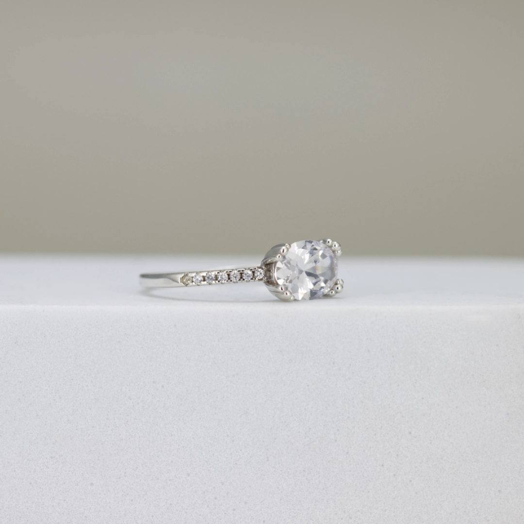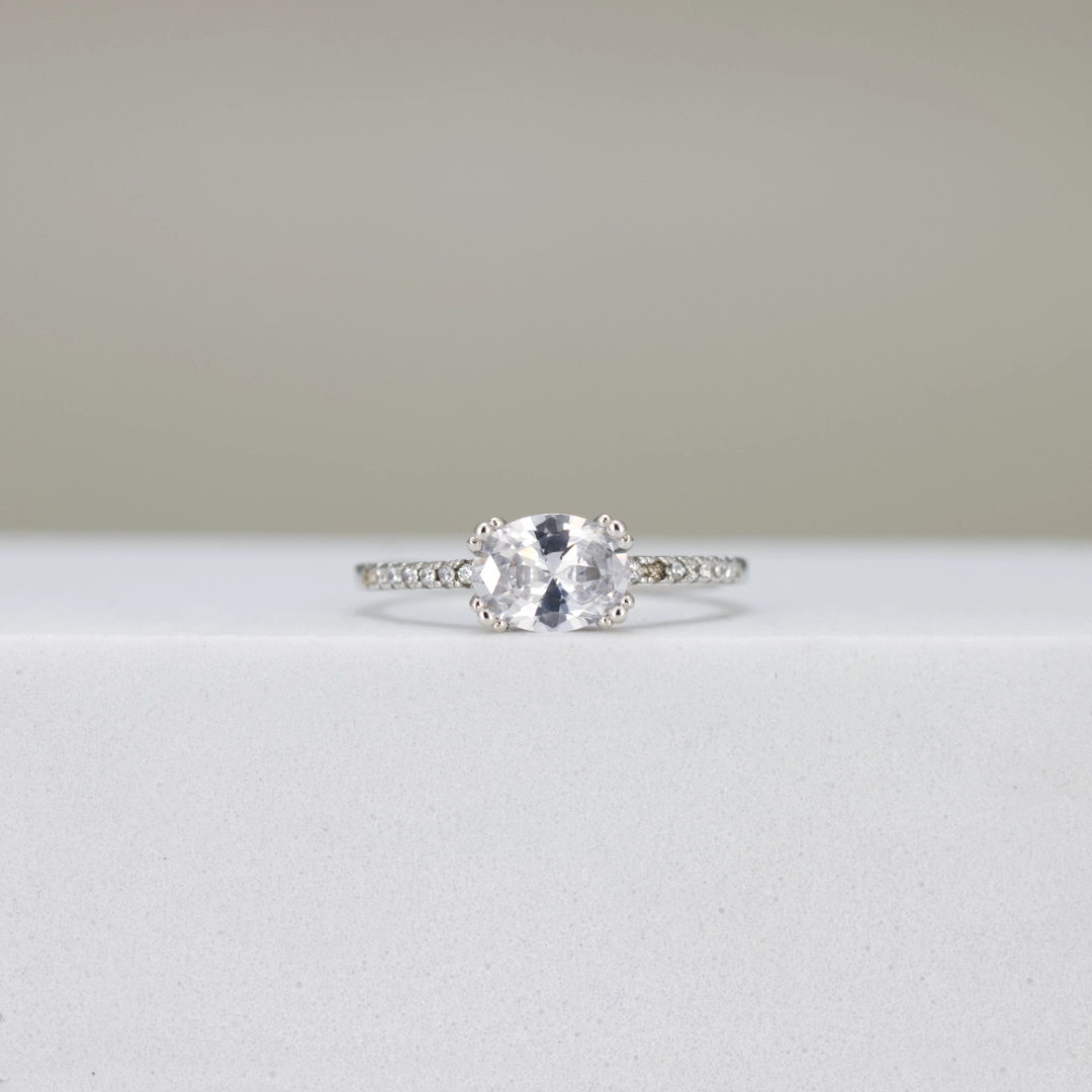 A refined design featuring an oval-cut center stone set in a classic four-prong setting, supported by a slim pavé band that adds just the right touch of sparkle. Elegant, minimal and beautifully balanced for everyday wear or a meaningful gift.