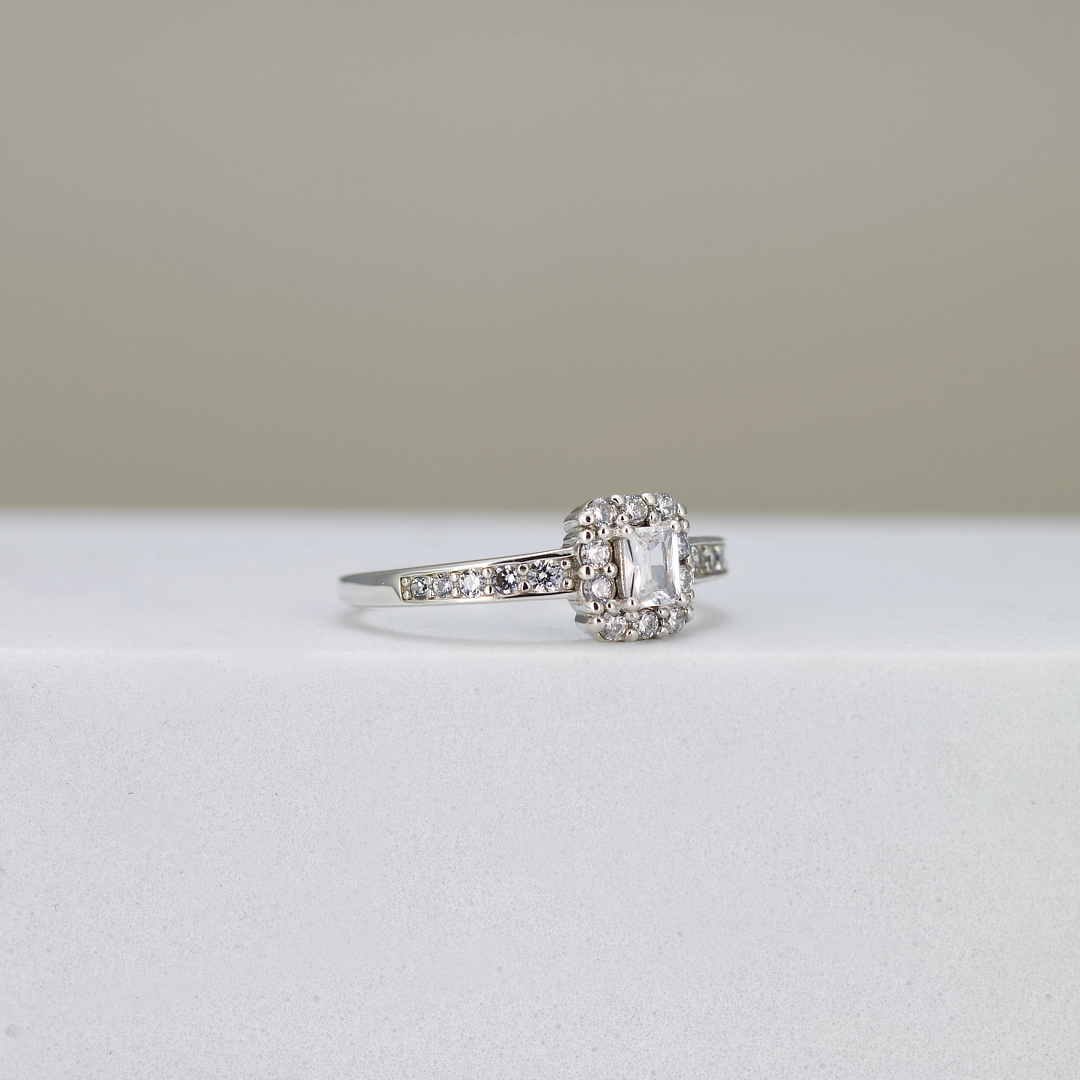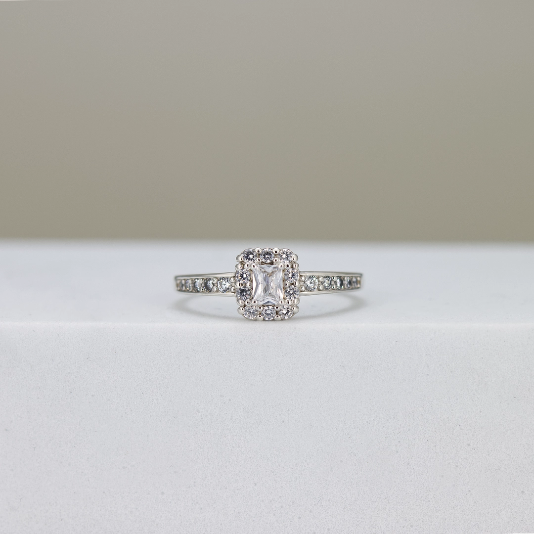 A graceful Radiant-cut centre stone framed by a delicate cushion-shaped halo for added brilliance. The slim band features micro-set stones that complement the centre without overwhelming it, while the elevated prong setting allows light to flow through the stone for enhanced sparkle.