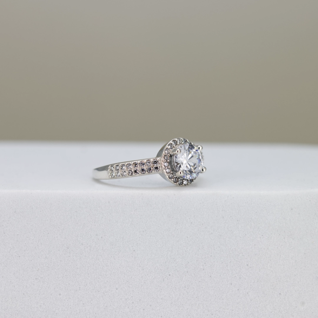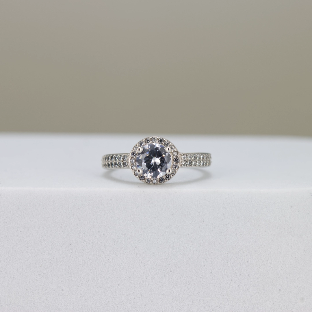 A radiant round-cut center stone framed by a shimmering halo and set on a triple-row pave band. This design offers extra sparkle from every angle while keeping a classic, elegant silhouette.