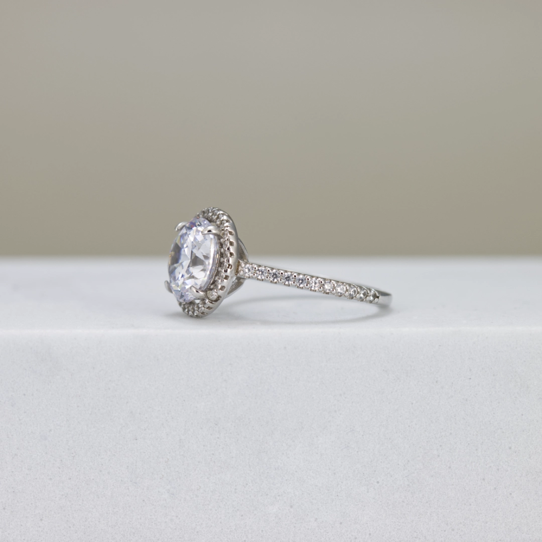 A round-cut centre stone framed in a delicate halo, set on a slim pavé band for added sparkle. Designed to enhance brilliance from every angle while keeping a refined, elegant profile.