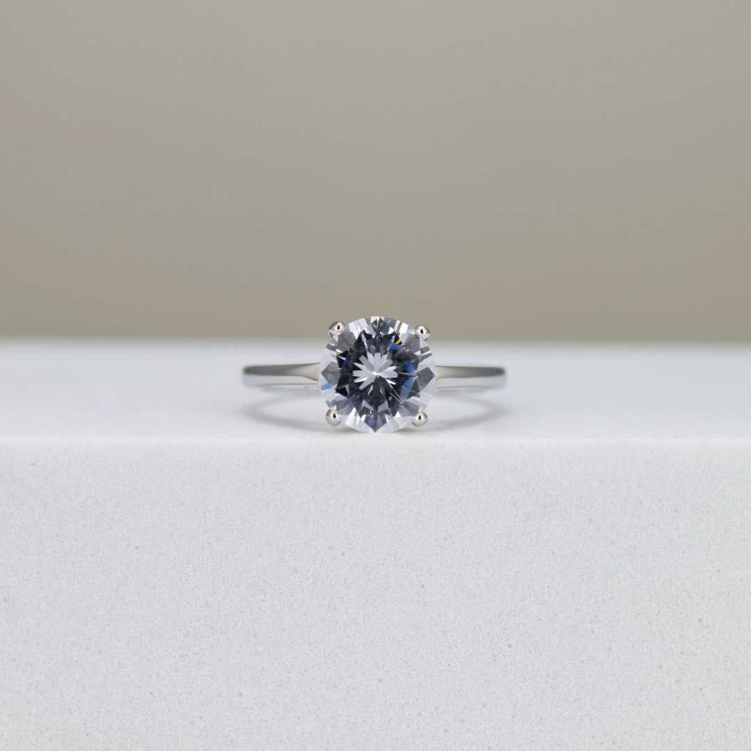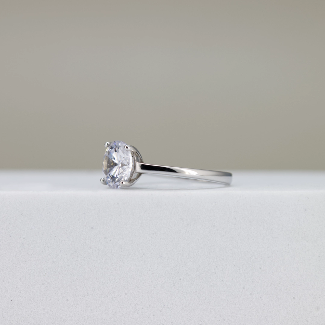 A classic round-cut solitaire set in a sleek four-prong setting, designed to highlight the brilliance of the center stone. Paired with a smooth, polished band, this elegant piece offers a elegant look with refined simplicity.