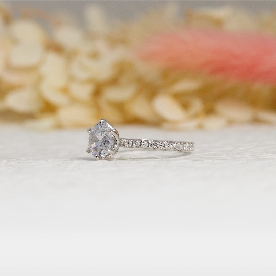 A timeless silver engagement ring featuring a brilliant round centre stone set on a slim band adorned with delicate stones for added sparkle. The classic solitaire setting keeps the design elegant and refined, while the shimmering band adds a graceful touch of brilliance.