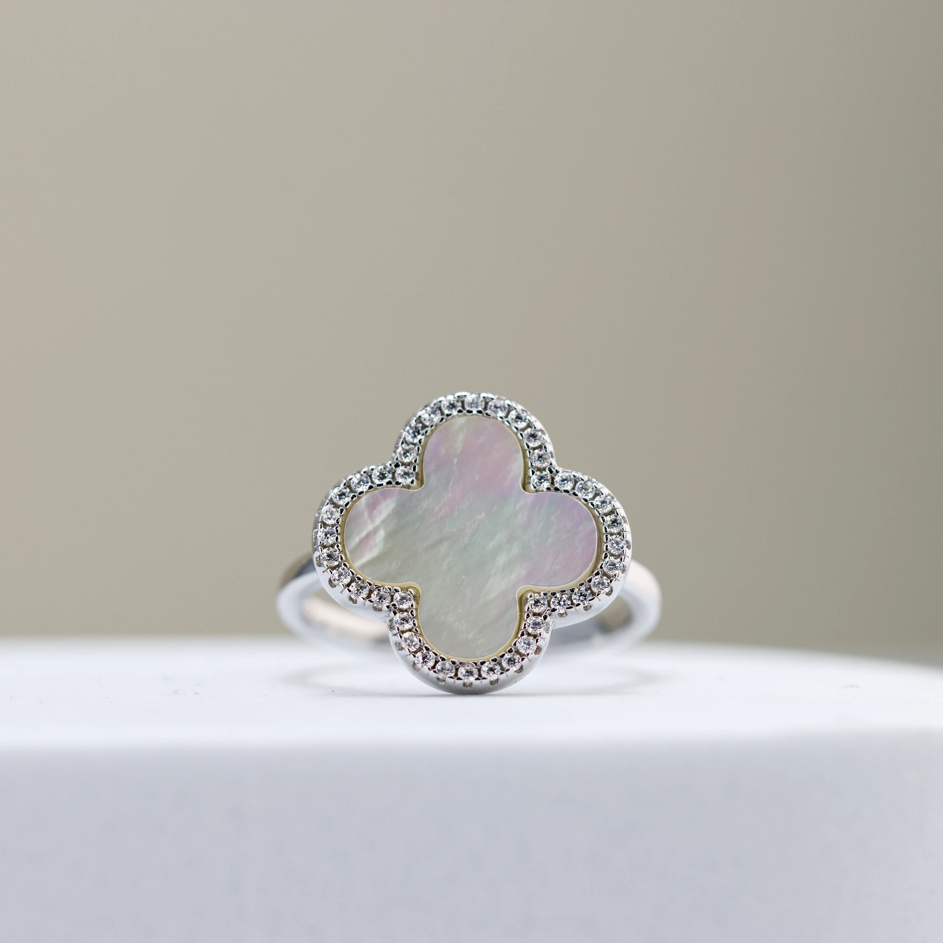 Graceful and luminous, this Silver Mother of Pearl Clover Ring brings sophistication to your look. The elegant four-leaf clover motif, crafted from iridescent mother of pearl, shimmers beautifully with every movement. A delicate border of sparkling stones enhances its glow, symbolizing luck, love, and harmony.