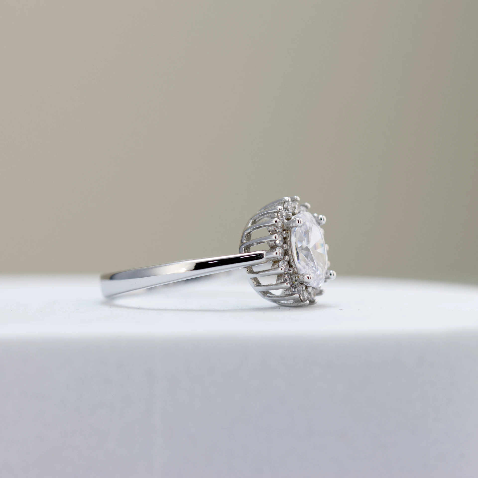 This Silver Oval Halo Ice Crushed Ring embodies radiance and grace. The oval-cut center stone catches the light with a captivating brilliance, surrounded by a delicate halo of smaller stones that enhance its sparkle. Set on a polished sterling silver band.