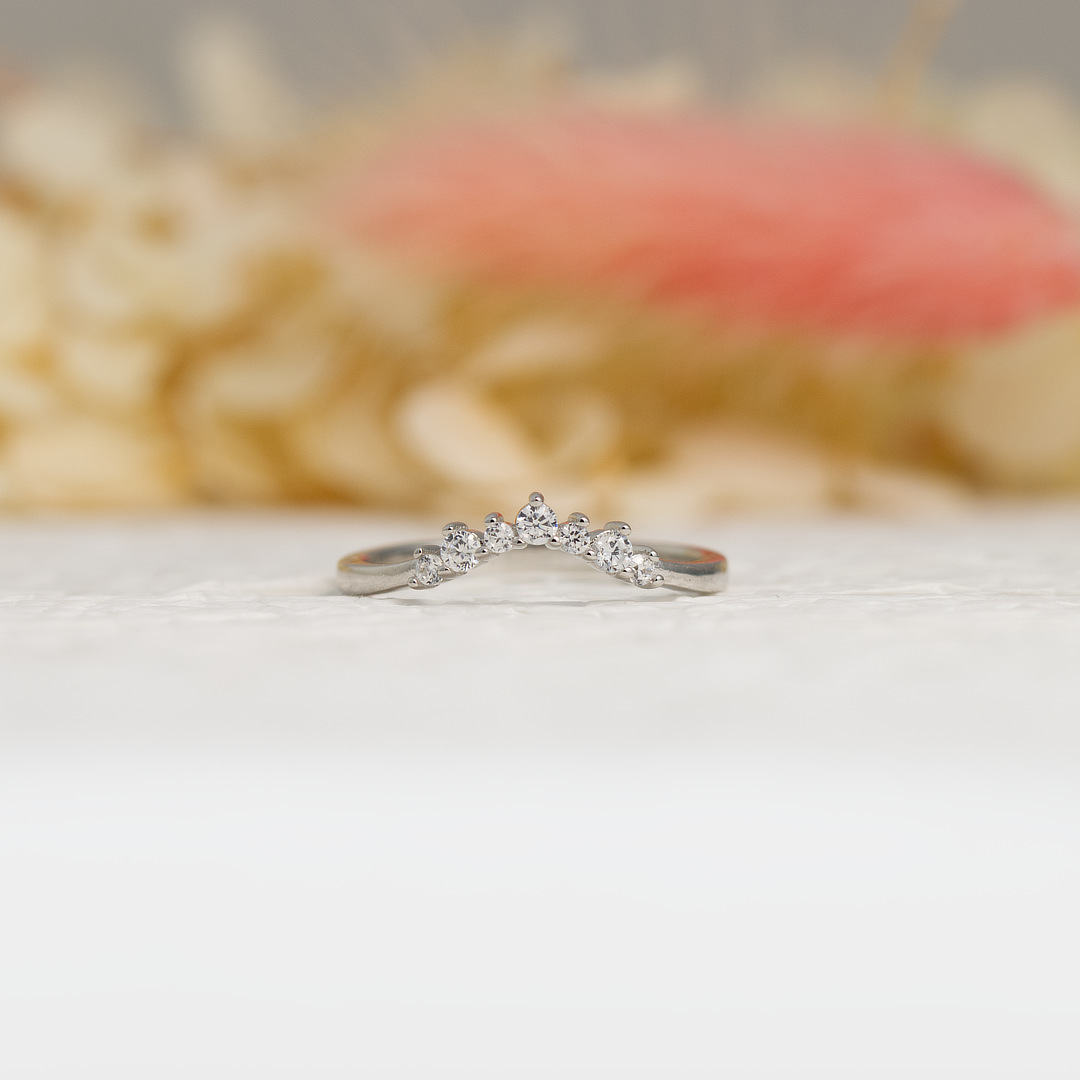 A beautifully crafted silver band featuring a graceful curved design set with a cluster of sparkling round stones. The gentle arc allows the ring to sit perfectly alongside solitaire or engagement rings, making it an ideal stacking or contour band.